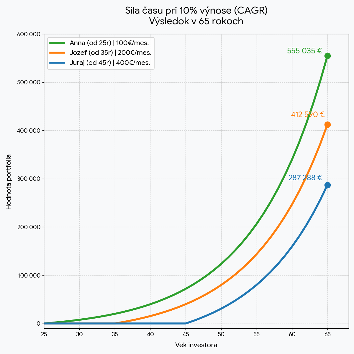 Rozdiel je obrovský. Anna investuje iba 100€ mesačne, ale na šesťdesiatpäťku si vyberie pekný darček – jej investícia bude mať hodnotu 555 035€. Jozef, ktorý začne investovať o 10 rokov neskôr a napriek tomu, že investuje mesačne dvojnásobok, skončí so sumou 412 590€. Najhoršie skončí Juraj – po 20 rokoch investovania, hoci investuje z trojice mesačne najviac, bude mať jeho investícia hodnotu „len“ 287 288€.